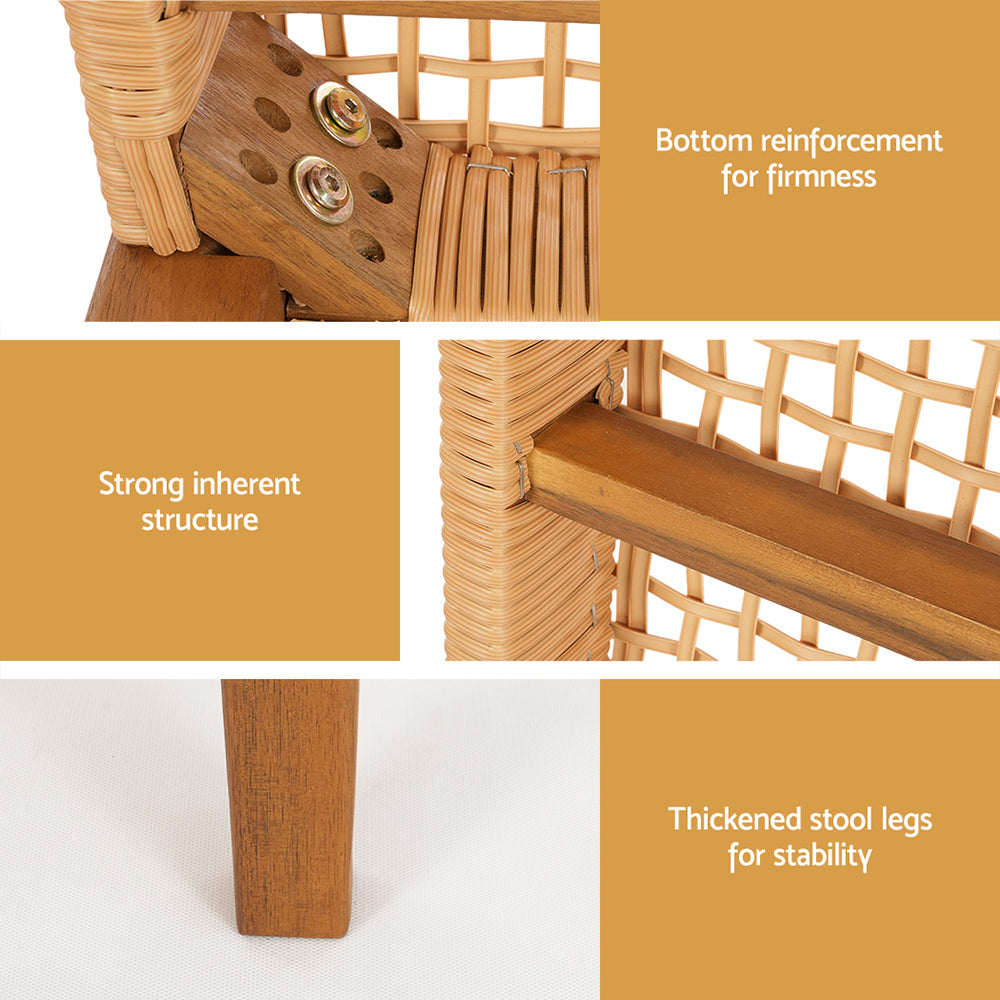 Create a relaxing outdoor spot with this classic 2-seater garden bench. Featuring a smooth rubberwood frame and a well-ventilated PE wicker seat, it offers a timeless look that suits patios, decks, gardens, and even indoor spaces. The solid timber construction provides reliable durability, while the woven seating ensures comfort and breathability in warm weather.